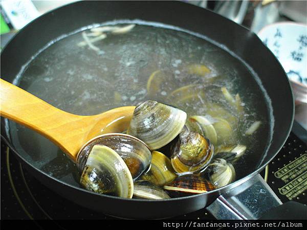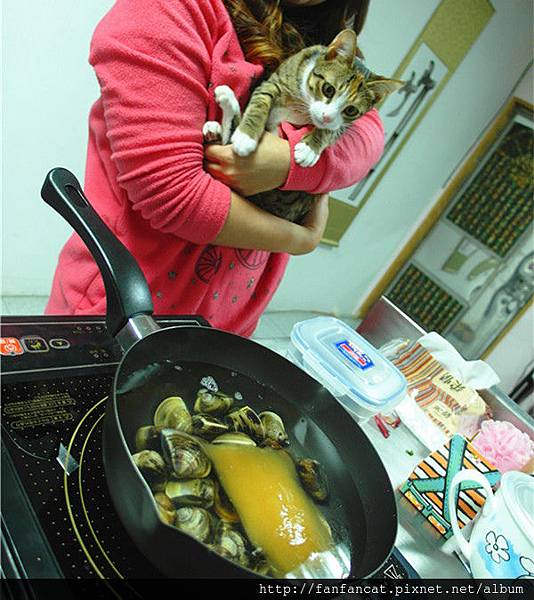 不過第一次嘗鮮,就決定走奢華路線的我們,用了一大包蛤蠣,少許薑絲,再放上鱸魚精粹放在電磁爐上慢慢熬煮,後來發現這根本是在考驗我們家咪醬小姐的定力來著,看看她目不轉睛盯著"獵物"的眼神,要是沒抱著的話,就一副很想到湯裡游泳的樣子啊!